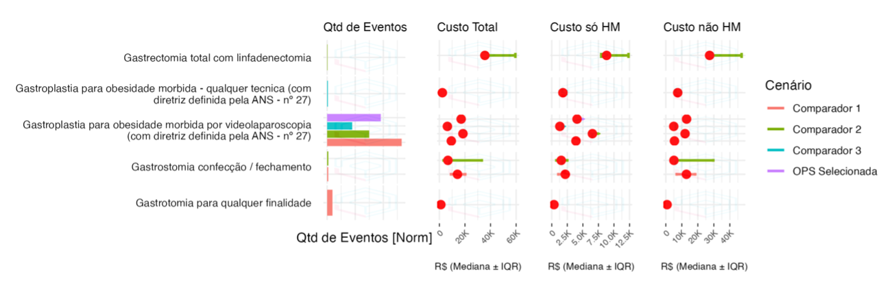 De longe, os procedimentos de cirurgia bariátrica são os mais frequentes no segmento gástrico. Pela quantidade de procedimentos, apesar de não ser a que menos realiza, também não é a que mais realiza este procedimento, tendo um indicador intermediário entre os três comparadores analisados. Quando analisamos o custo, notamos que o custo em HM está na média entre as comparações, mas apresenta o maior custo do tipo não-HM.